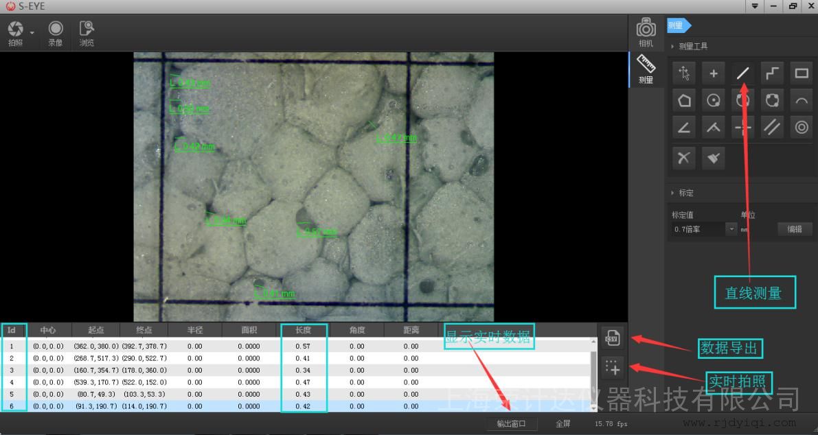 进入测量界面,选择直线测量:选择起点单击鼠标,选择终点单击鼠标,即为一个测量数据,测量数据报告在输出窗口显示。