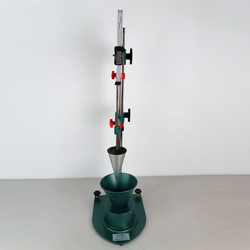 仪器主要由底盘、支架、数显标尺、标准试锥(连刻度尺)和盛料容器组成。
