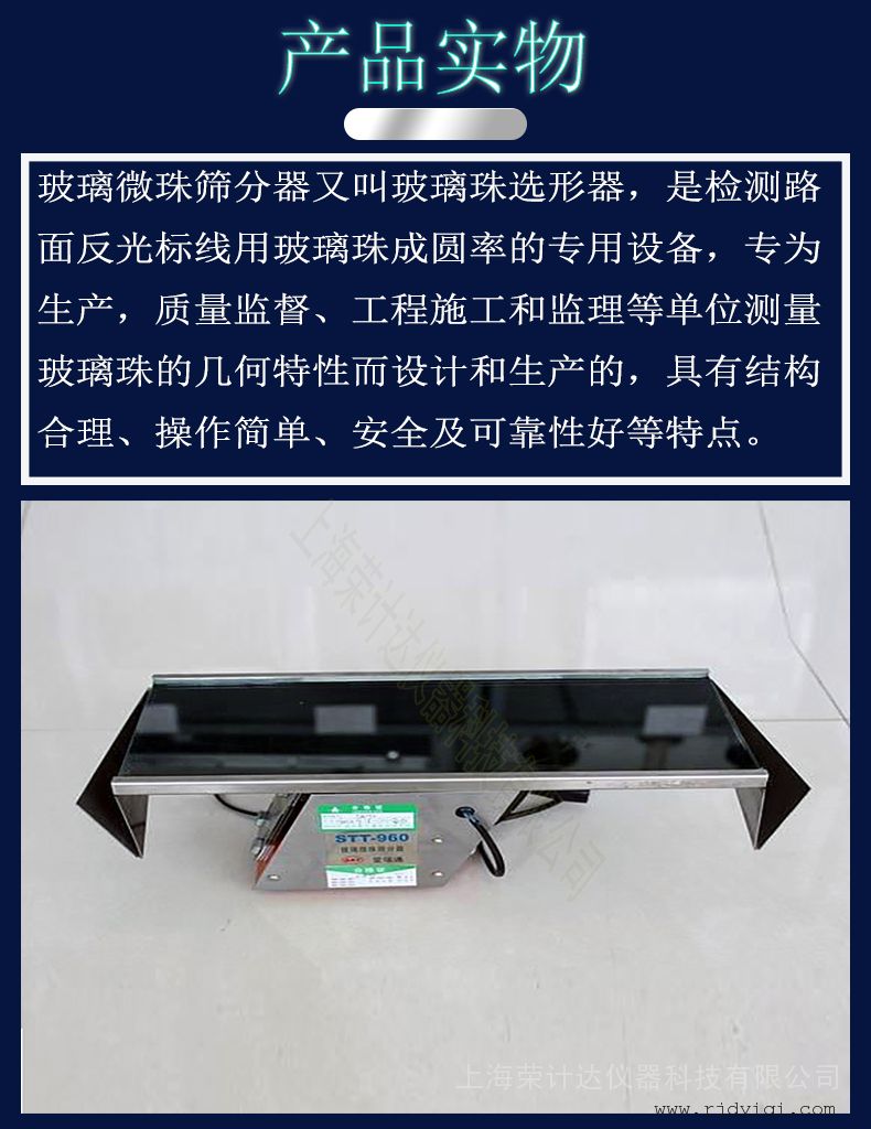 玻璃微珠筛分器又叫玻璃珠选形器,是检测路面反光标线用玻璃珠成圆率的专用设备。STT-960玻璃珠筛分器专为生产,质量监督、工程施工和监理等单位测量玻璃珠的几何特性而设计和生产的,具有结构合理、操作简单、安全及可靠性好等特点。