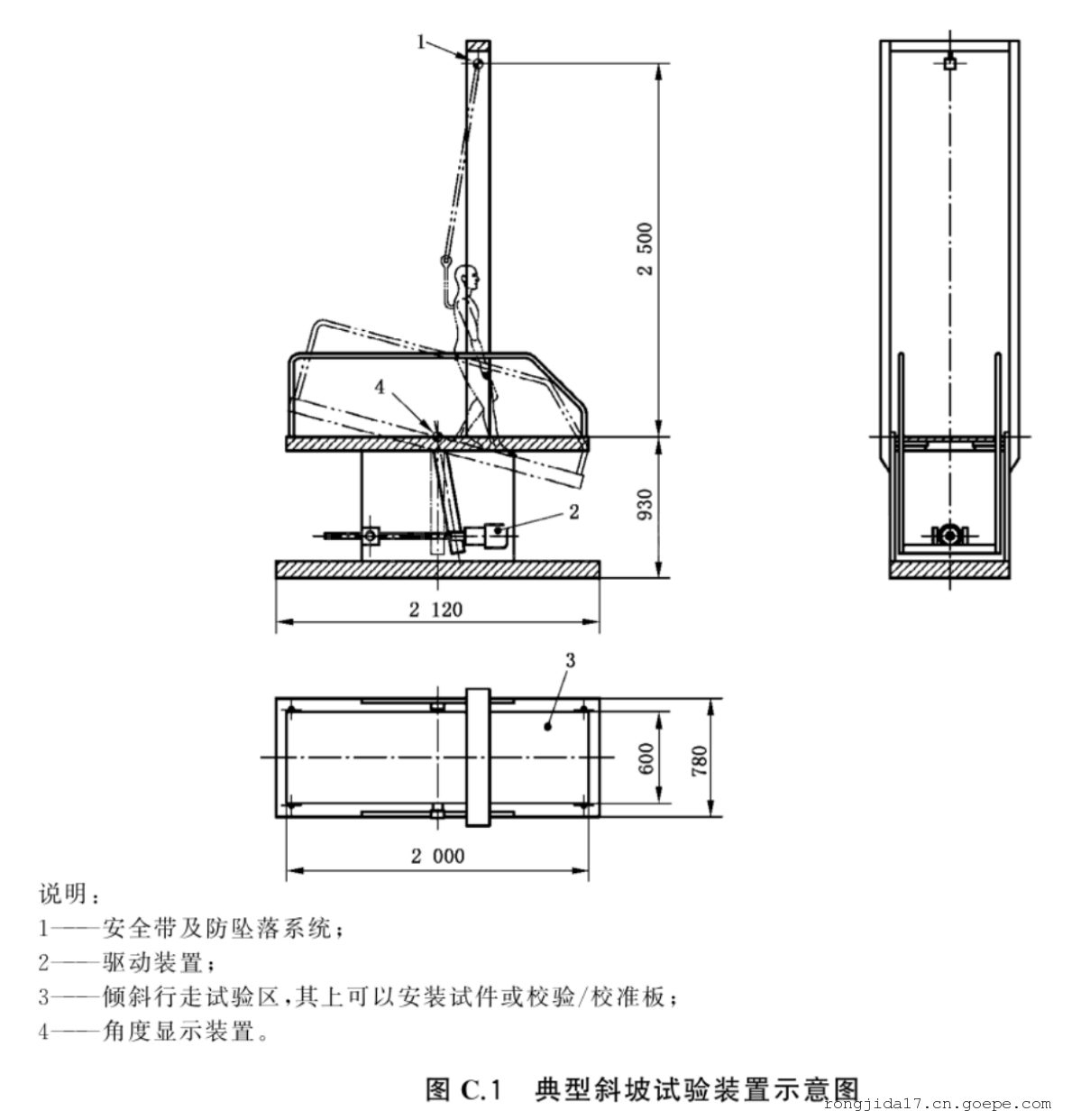 试验装置主要由一个上面能安放试件、两旁有护栏、上方有安全带等安全装置的宽约600 mm、长 约2 000 mm的平台构成。平台受试验人员控制,能以水平位置开始在0°“45°之回连续转动、转角精 度士0.2,因试验人员在!:面行走而对角度的影响不应超过十0,5平台还配套有在试验期间能以(6.0+LO)L/min的流觉将洗涤剂溶液大致均匀喷洒在试件表而的喷水装置。试验装置示意图见图C.1.