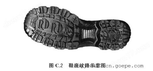 7测试用鞋:符合GB21148的II类全聚合材料中聚氨酯底(PU)低帮鞋,邵氏硬度(A型)为73±5,鞋底纹路与图C2类似。*使用之前,用P400碳化硅砂纸将鞋底全部均匀打磨一遍,使整个鞋底露出新面,用干净的软毛刷将粉末制干净。 8试件